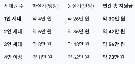 세대원 수에 따라 차등 지급되며, 2026년은 물가 상승을 반영해 금액이 더욱 커졌습니다. (아래는 연간 총액 예시입니다.)